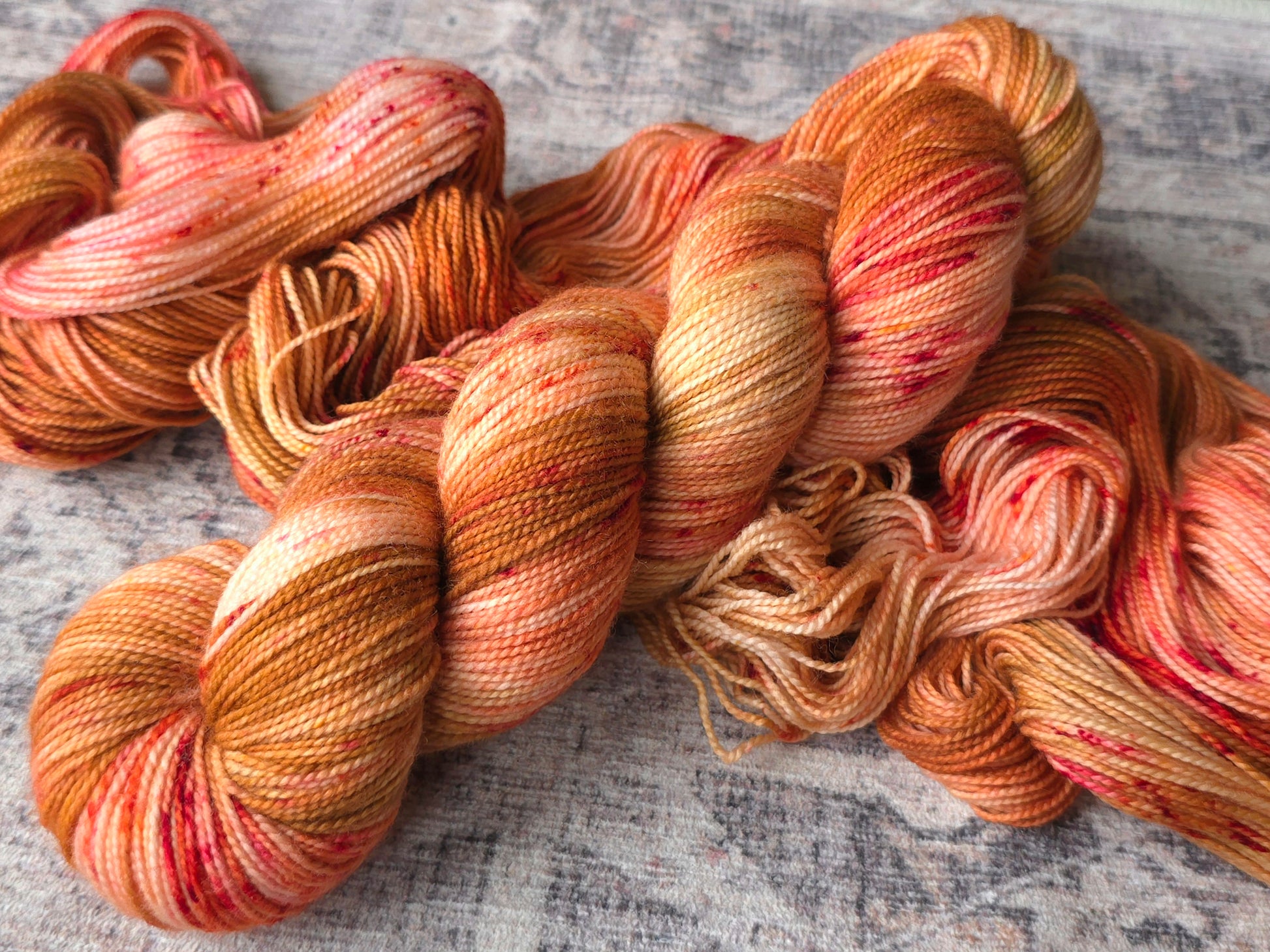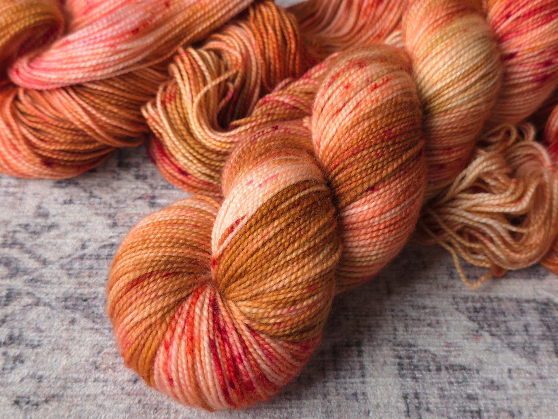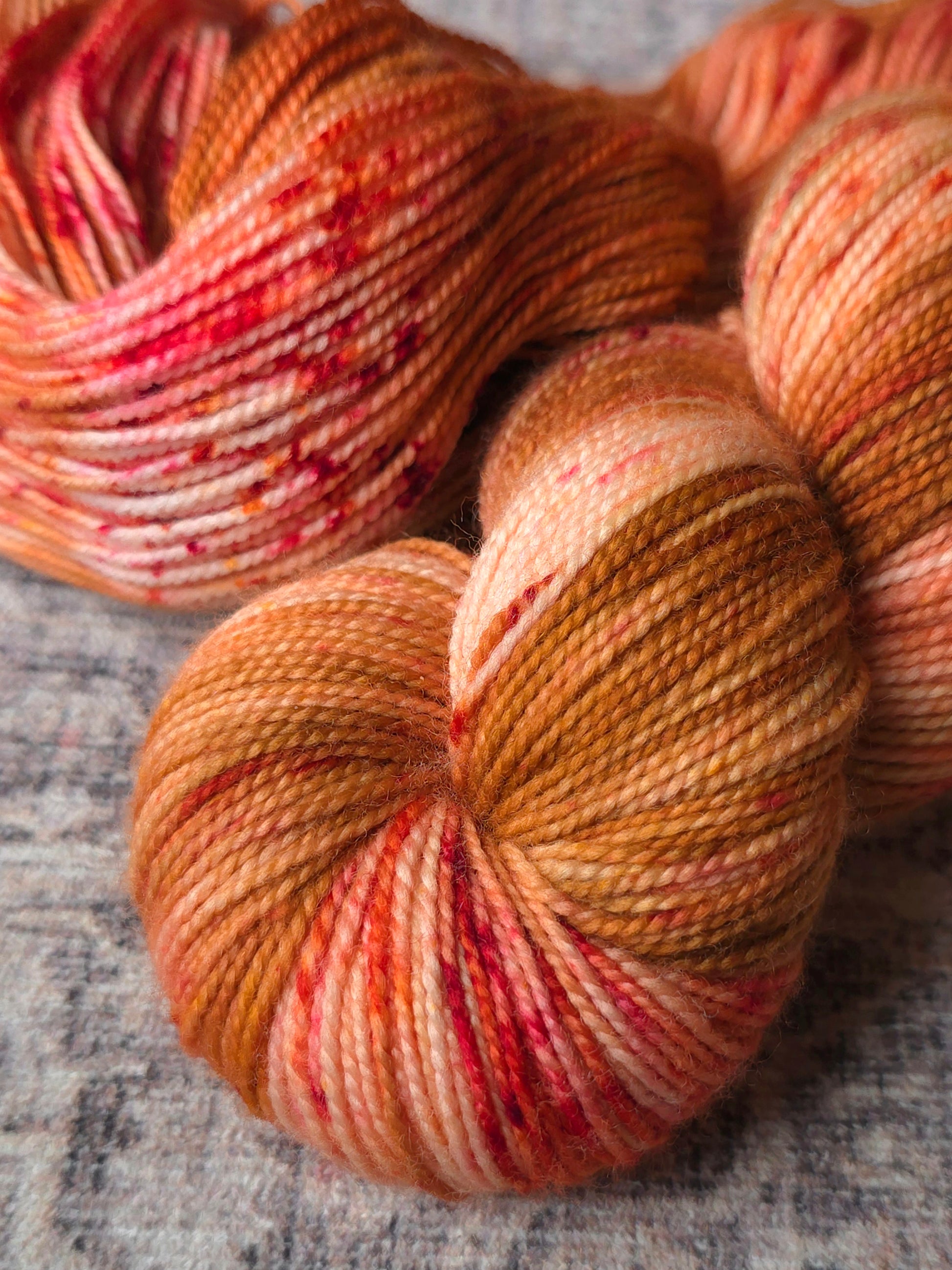 This yarn features warm layered tones reminiscent of the classic Wisconsin supper club cocktail, the Brandy Old Fashioned. Soft orange and toasty brandy are topped off with maraschino cherry red speckles, Valerie's garnish of choice!