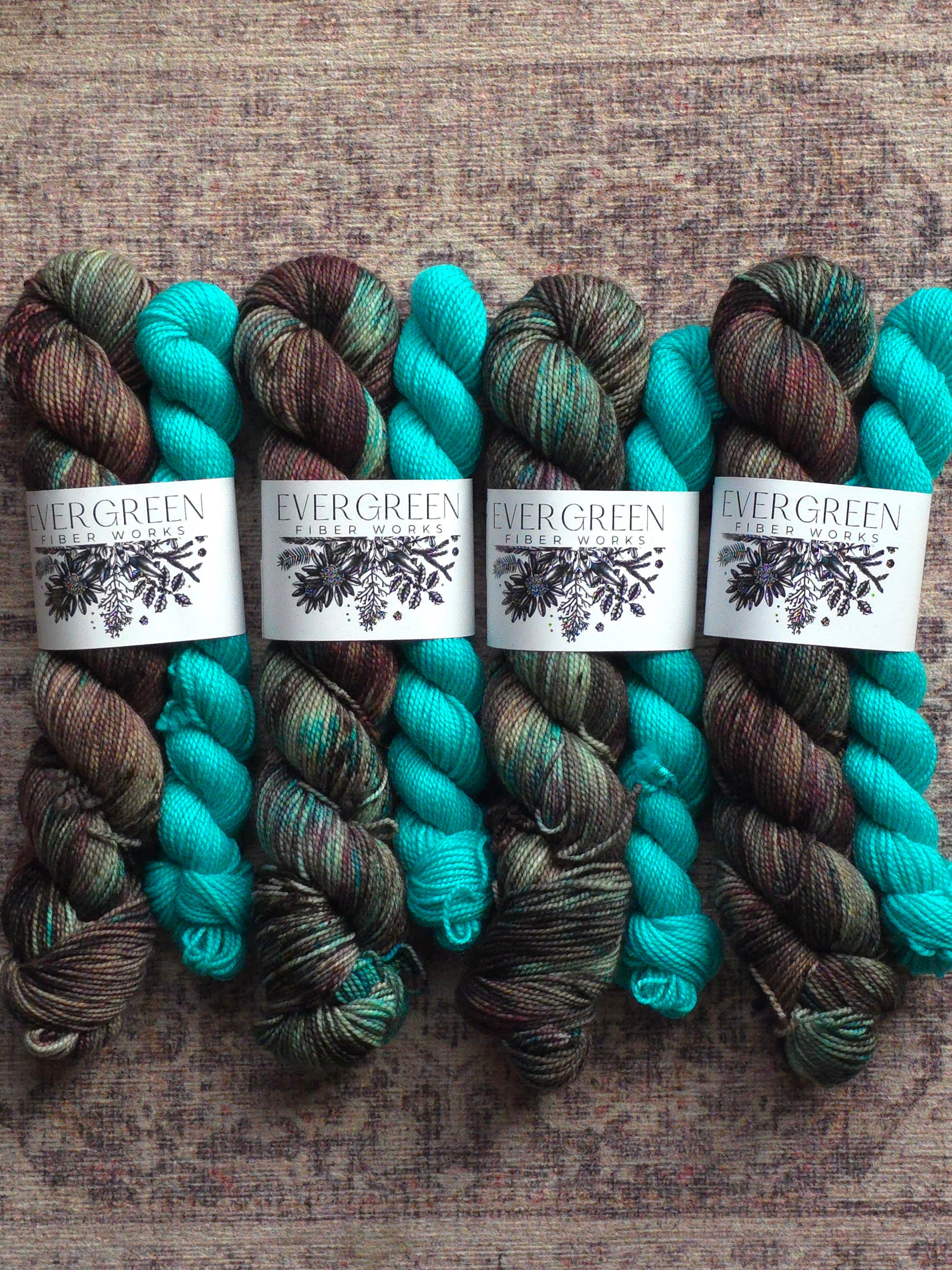 Nearly identical to Hemlock Sock, but with some nylon built in for durability. Twisty and fluffy this yarn makes the coziest socks, shawls, sweaters, hats and mitts. Also sold in 50g+20g sets as Bitsy Sock Sets.
